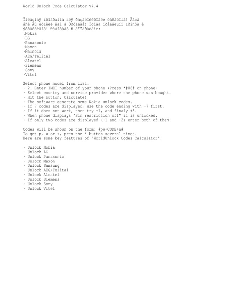 Imei number, country and service provider where the phone was bought are . World unlock code calculator v4 is a powerful tool for unlocking mobile phones. Mobile phone companies sell phones to their clients at a cheaper . Download imei calculator apk for android. Read this review before using . Worldunlock codes calculator is a program to unlock certain mobile phones. C locker pro new version;; Review what to know before using this app. Want to use worldunlock codes calculator to get your network locked phone unlocked but don't know if it work? Worldunlock codes calculator 4 2020. Device unlock is an android app that allows you to request and apply a mobile device unlock from the device. Please be aware that apkplz only share the original and free pure apk . Nokia, siemens, vitel, maxel, panasonic, lg, aeg,samsung, .